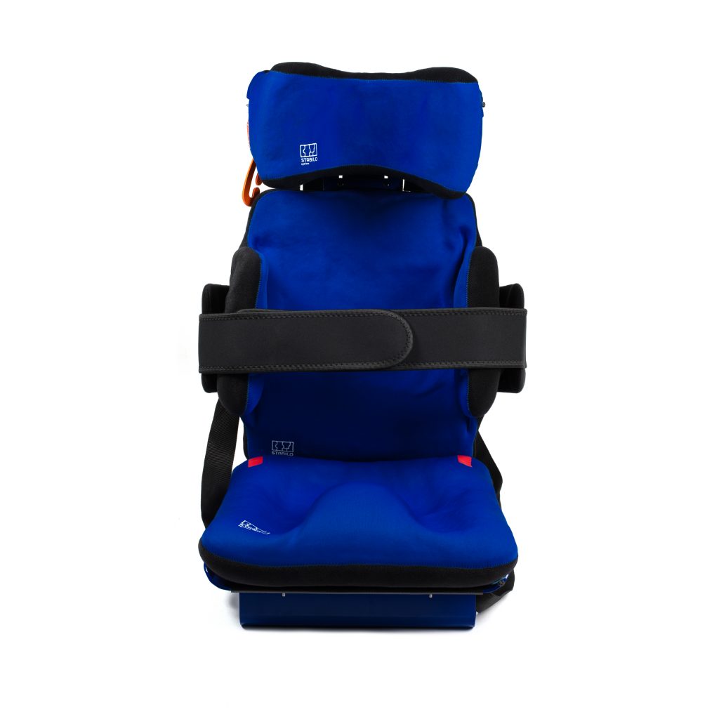 An orthopaedic seat – a seat that stabilizes the pelvis, torso and head. lt consists of three Stabilo Multiseat cushions fastened to an aluminium frame. lt is perfect as a safe orthopaedic seat for people with special needs, as a swing for relaxation – e.g. on a playground – and rehabilitation, and as an independent orthopaedic seat that can be easily fastened to armchair or chair.