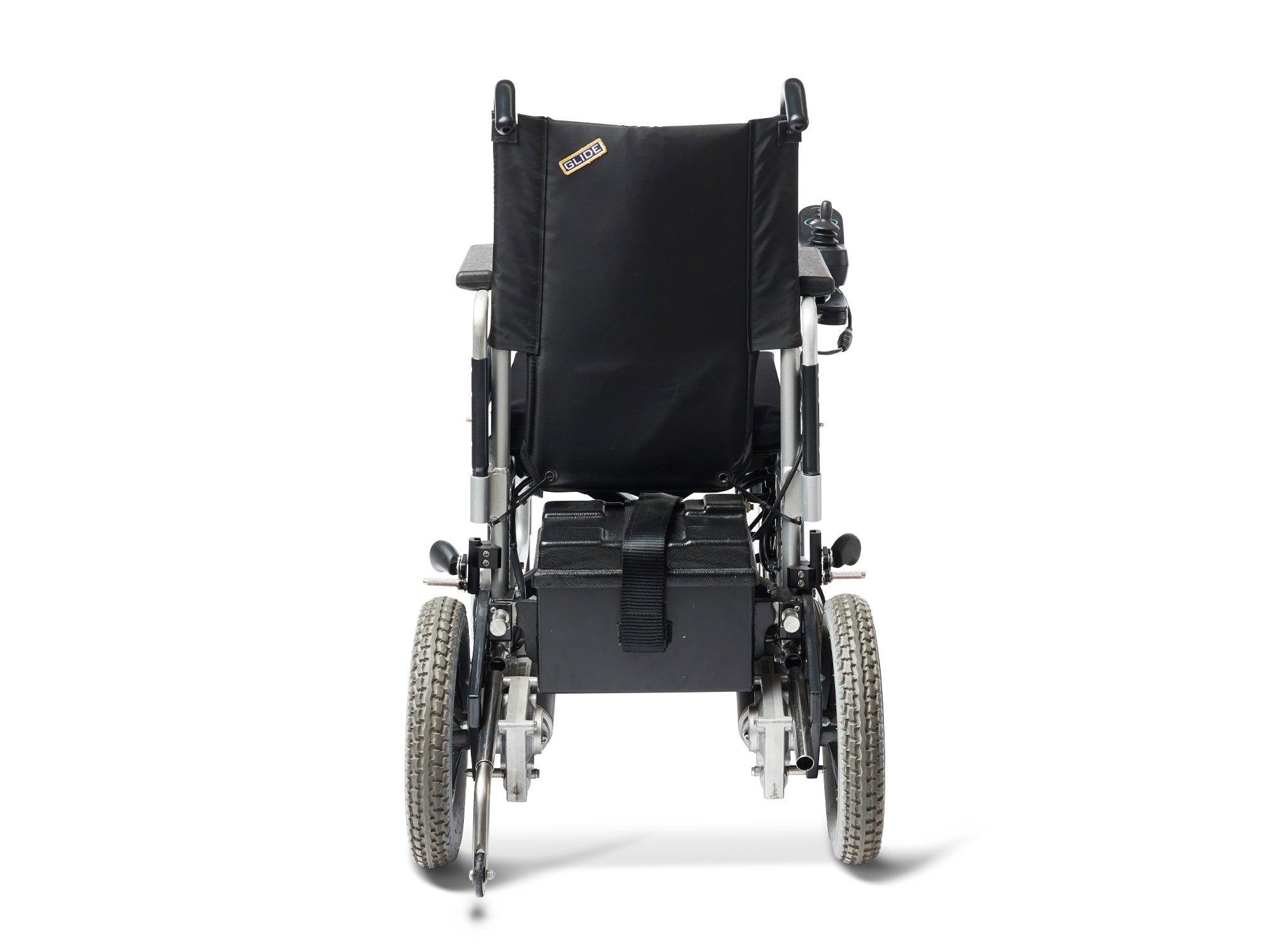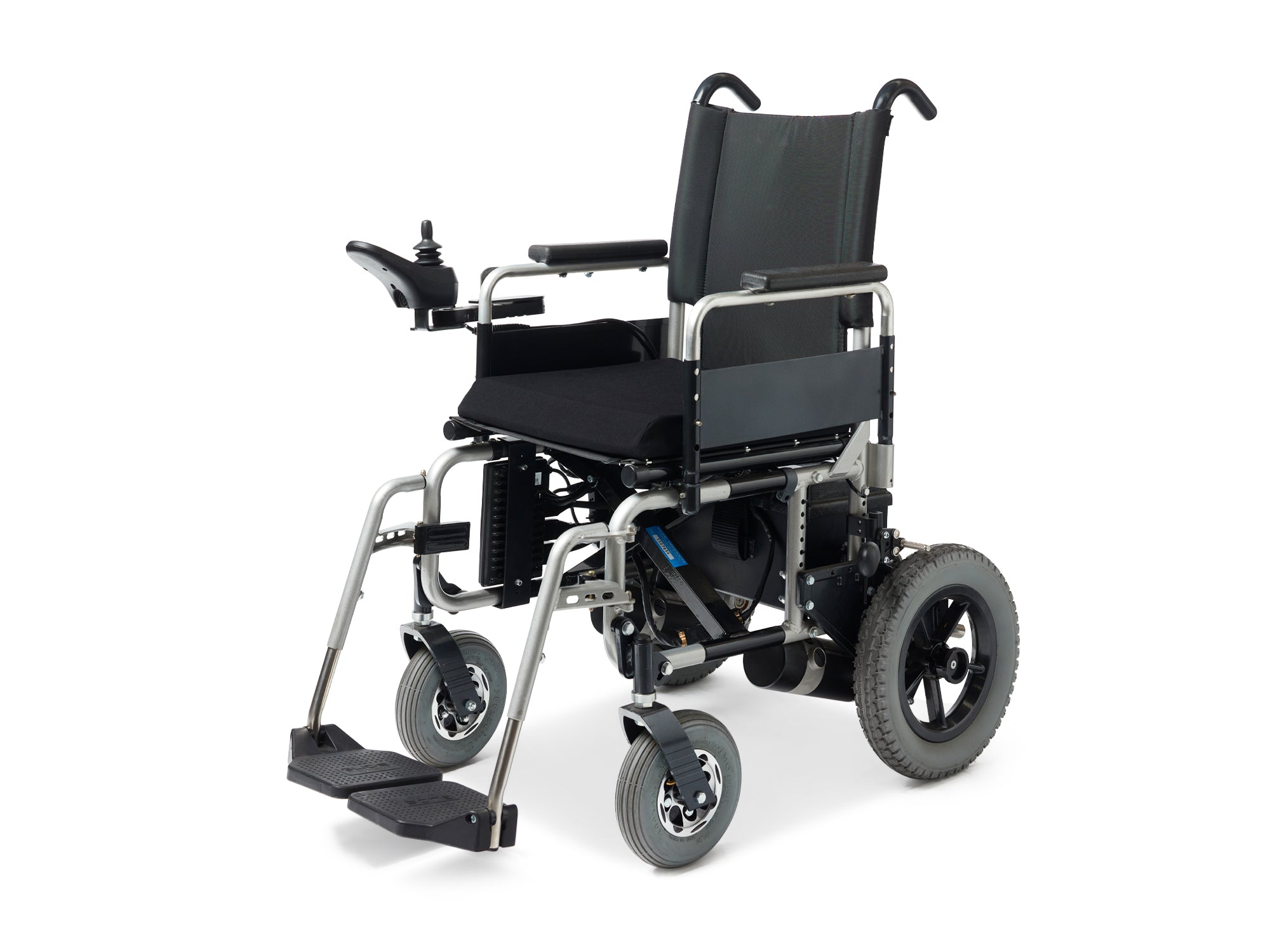 This rear-wheel-drive powered chair is constructed with lightweight aluminium, which increases the endurance and range of the battery.
