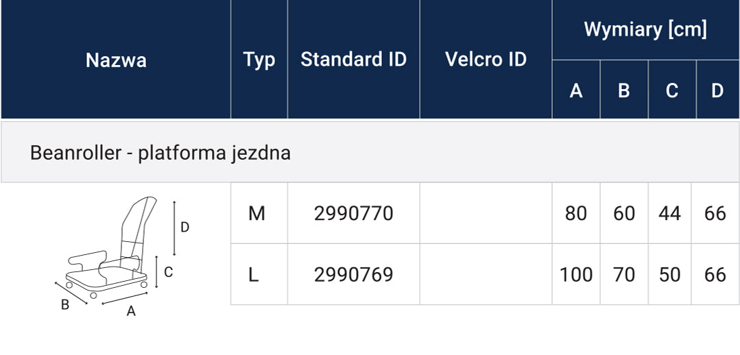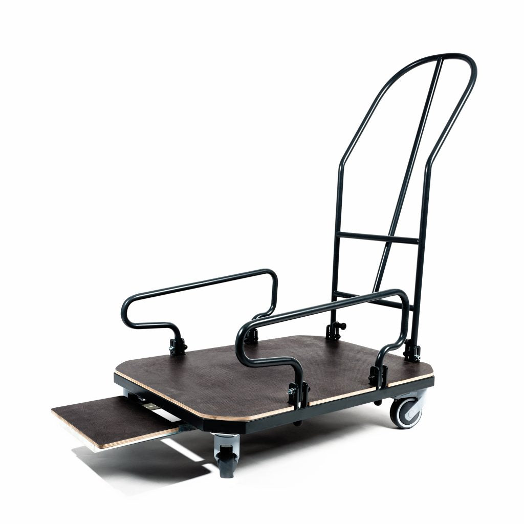 Portable wheelbase for transport of Beanseat seats. Equipped with a footrest and handle, it allows for easy patient transport between rooms.